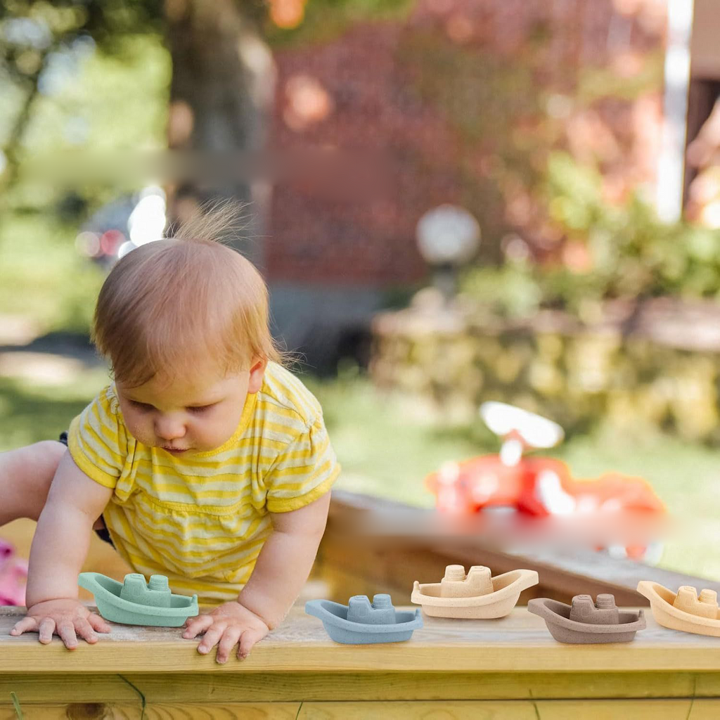 O formato empilhável economiza espaço e incentiva a criança a desenvolver coordenação e raciocínio ao organizar os barquinhos.