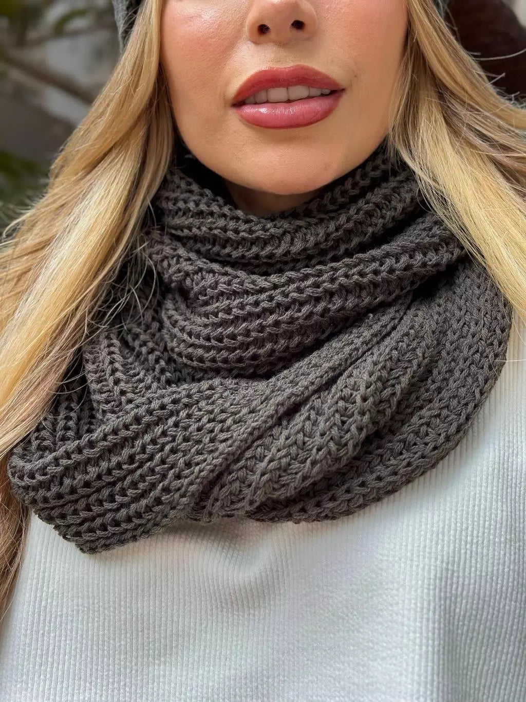 Seu formato circular permite envolver o pescoço com facilidade, criando um visual moderno e acolhedor.