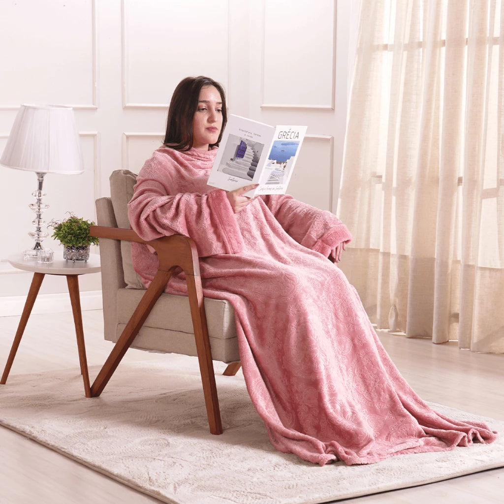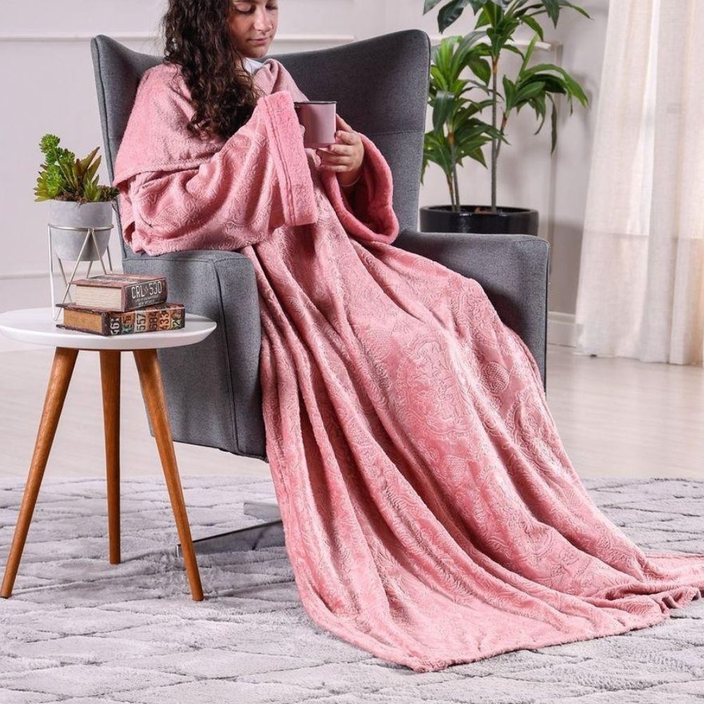 Diferente dos cobertores tradicionais, este modelo com mangas proporciona liberdade de movimento sem perder o calor.